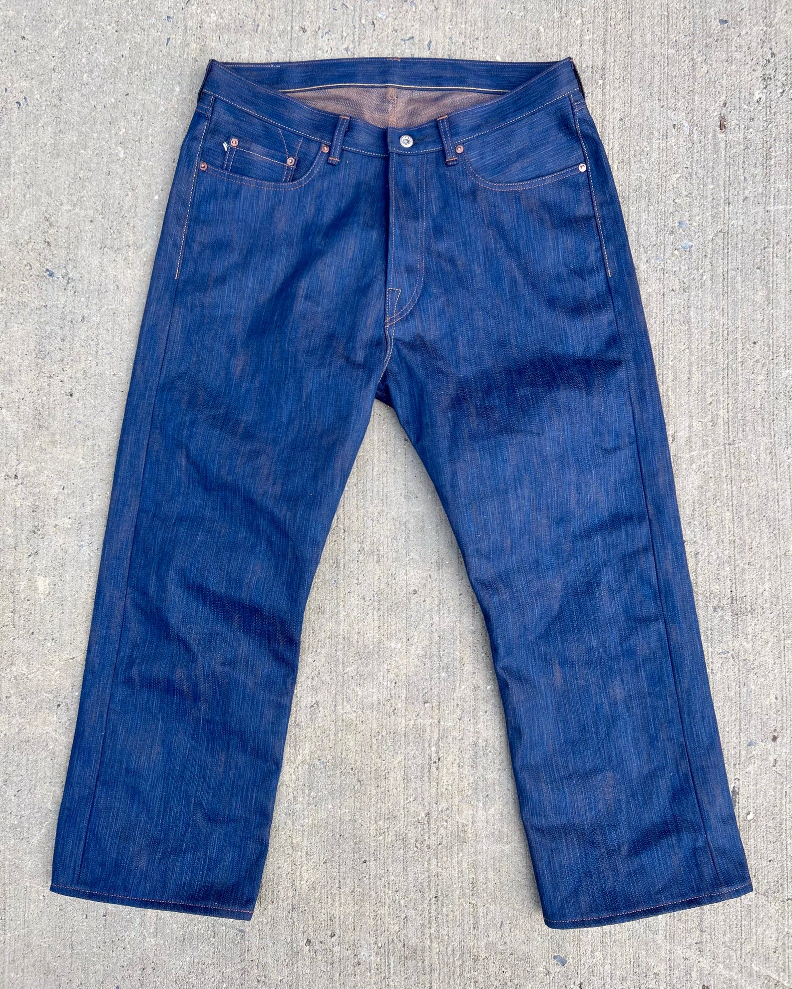 Woven on vintage shuttle looms in Japan, this fabric features uneven slub yarns that capture the look and feel of hand-spun yarns. The warp is hank-dyed in natural Japanese indigo, and the weft in plant-based persimmon, creating subtle, unique variations that develop beautifully over time.